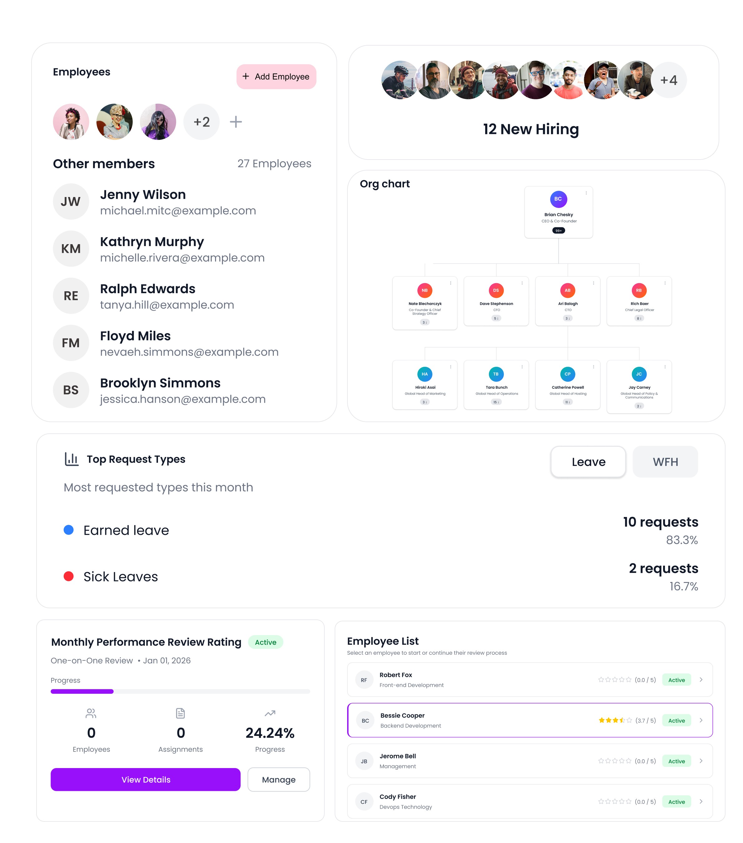 Profiles, directory, lifecycle tracking, and workforce analytics.360° employee view with planning and succession insights.