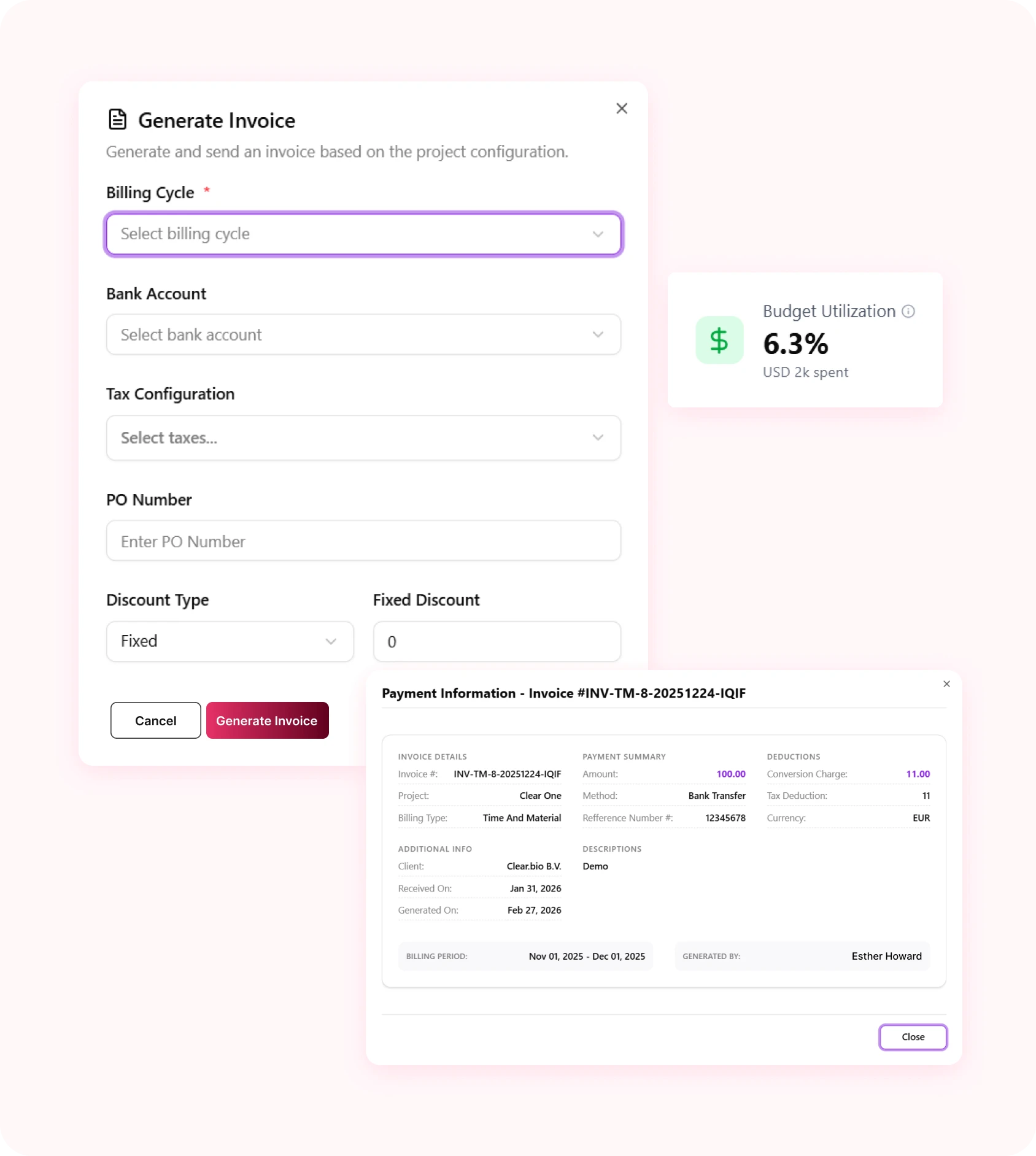 استخرج الفواتير مباشرة من بيانات المشروع وأدر عمليات الفوترة بكفاءة. تتبع المدفوعات وحافظ على الشفافية المالية عبر كافة المشاريع.