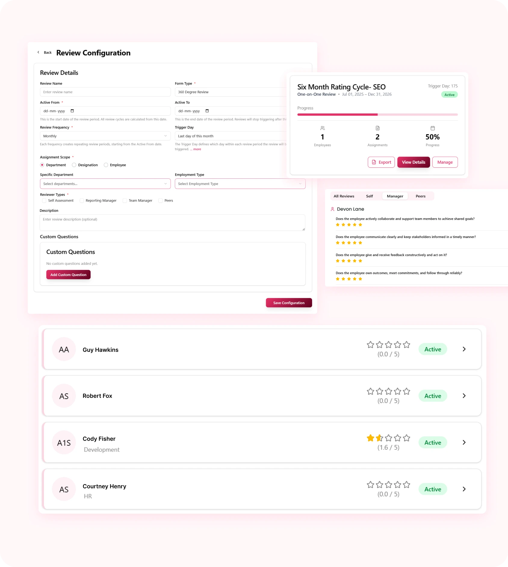 We didn’t build a feature list. We mapped how real managers, HR teams, and employees actually run performance cycles and built around that. No onboarding consultant needed. No months-long implementation.