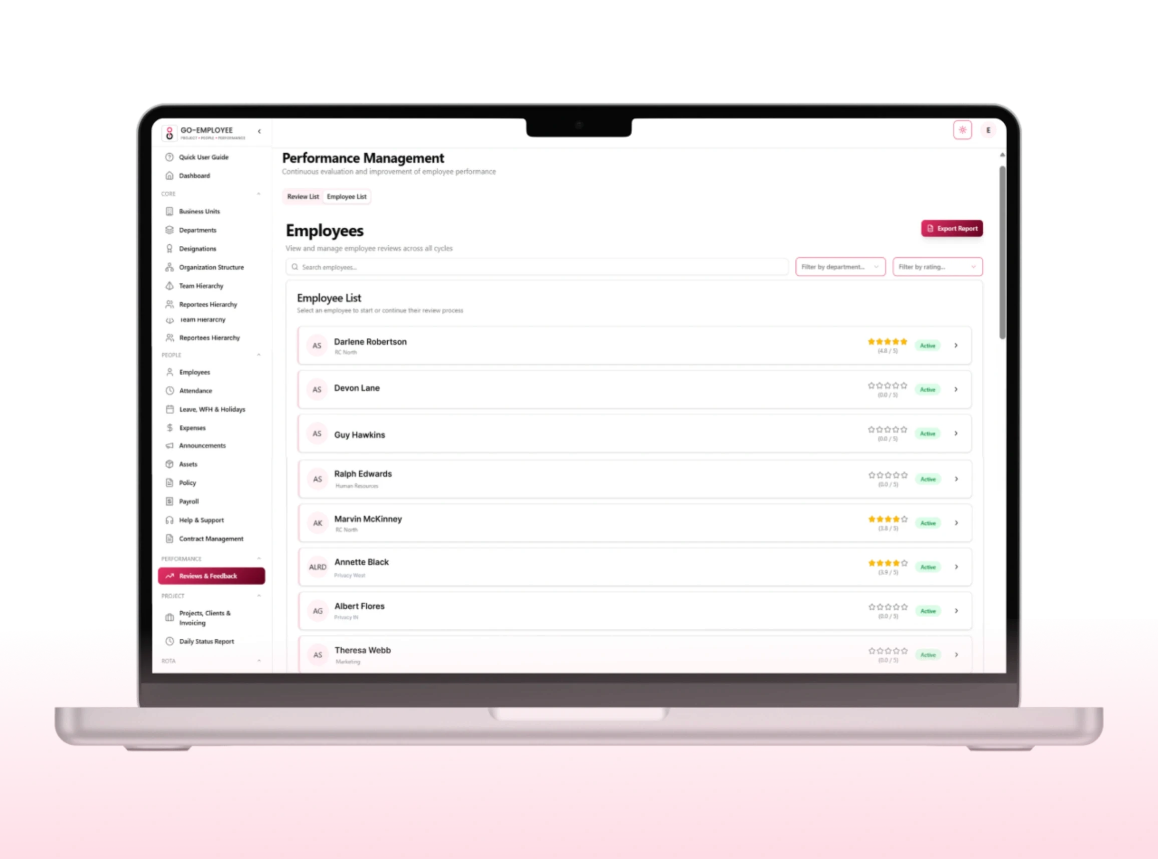 Go-Employee turns performance data into decisions. Role-based dashboards surface the right insights for the right people whether that’s an HR director looking at org-wide trends or a team lead checking in on one person’s goals.